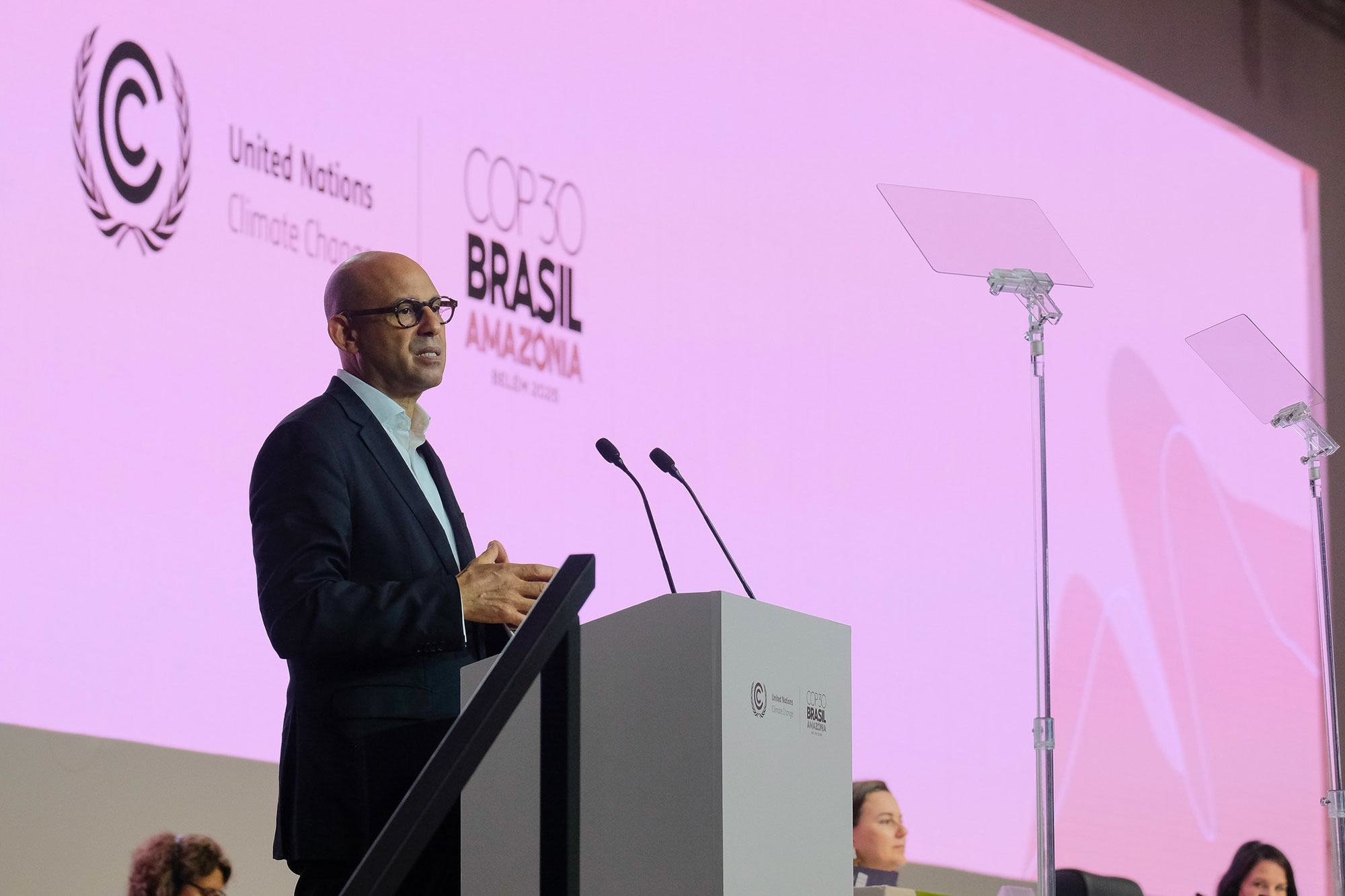Исполнительный секретарь Рамочной конвенции ООН об изменении климата Саймон Стил выступает на КС-30 в Бразилии.